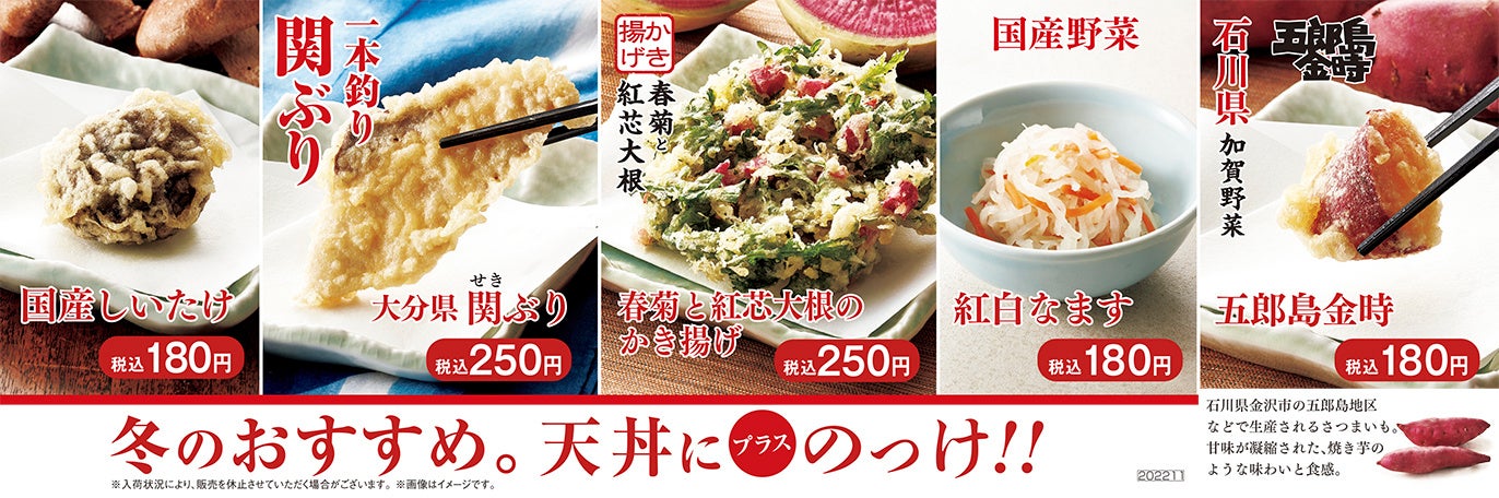 単品で手軽に味わえるのっけに冬の国産素材5種類が登場。加賀伝統野菜の1つである、さつまいも「五郎島金時」、丁寧に一本釣りで釣り上げている大分県産「関ぶり」、国産野菜で仕上げた「春菊と紅芯大根のかき揚げ」、「国産しいたけ」、さっぱりとした人参と大根の紅白なます(ゆず入り)を揃えました。