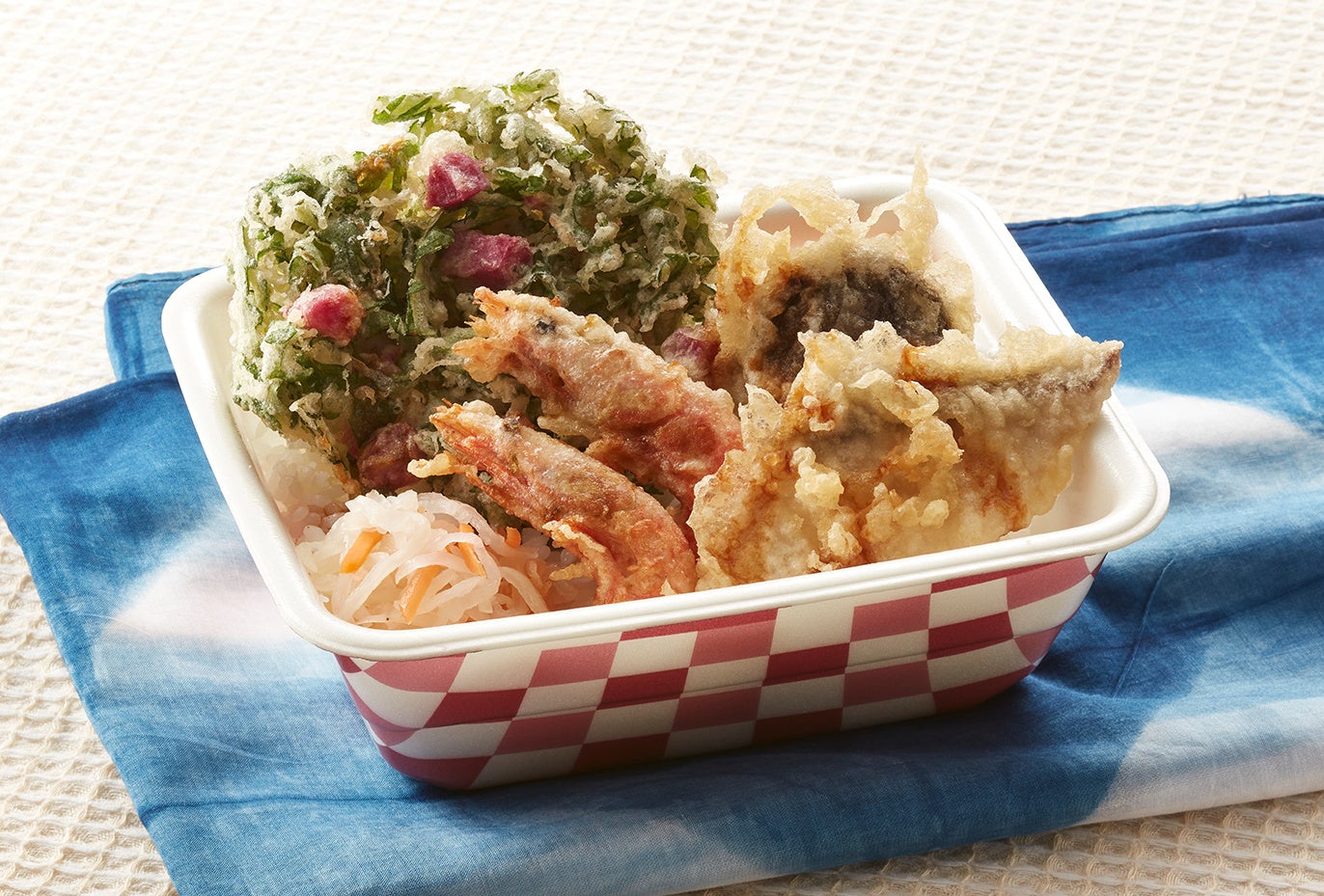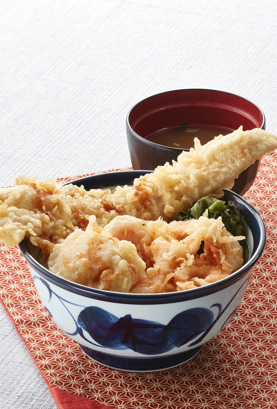 速吸(はやすい)の瀬戸で育った大分県豊後水道の「関ぶり」、海老の味が楽しめる「殻付き甘えび」(2尾)、冬の定番野菜である春菊と、目でも楽しめる色鮮やかな紅芯大根の「春菊と紅芯大根のかき揚げ」、肉厚で食べ応えのある「国産しいたけ」に国産素材を使用した紅白なます(ゆず入り)を添え、冬の幸がこの一杯で楽しめる天丼です。