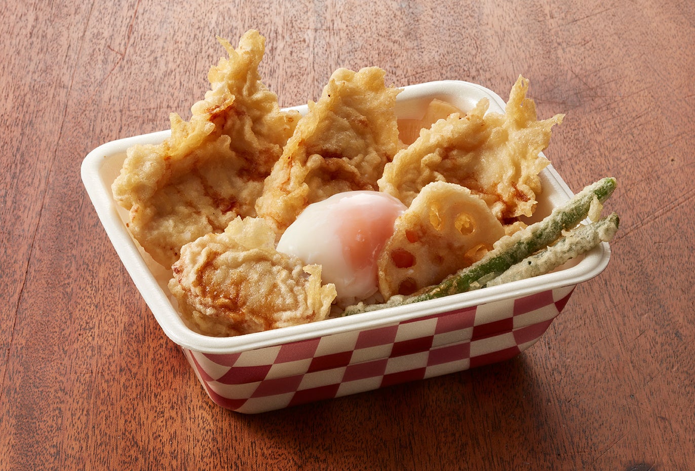 『親子鶏天丼』は、てんやで人気の「とり天」が3枚、サクッとした食感を楽しめる「れんこん」、「いんげん」、華味鳥を使用した「つくね」に半熟玉子をのせ、ボリューム満点な天丼に仕上げました。