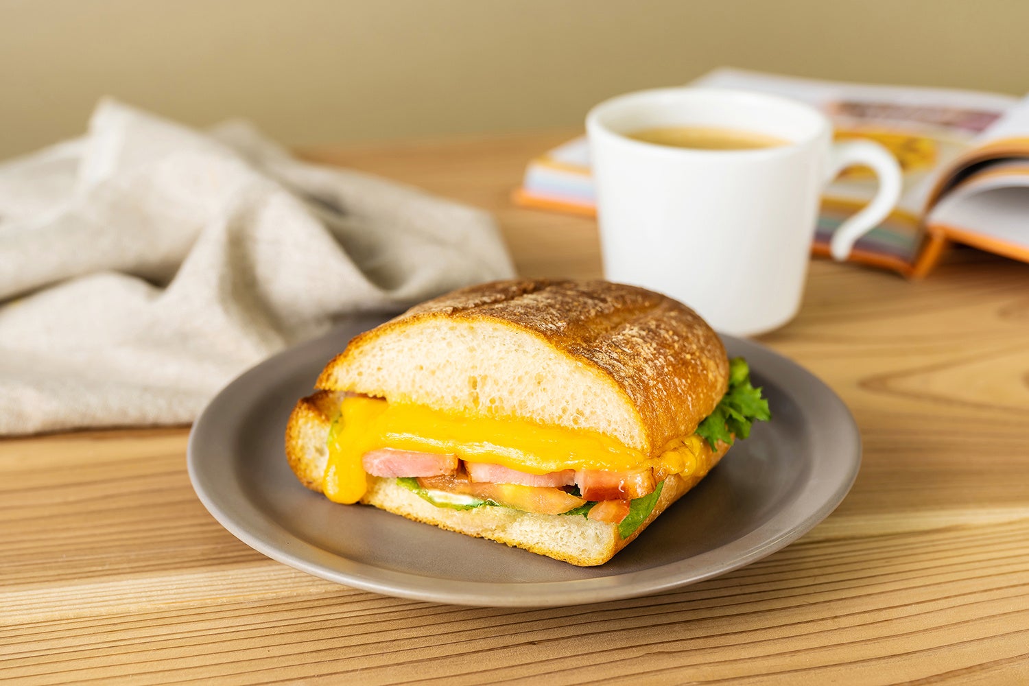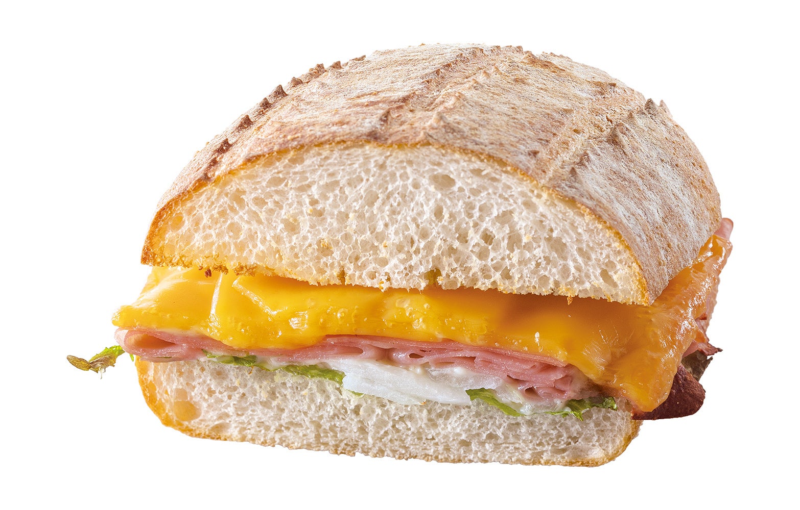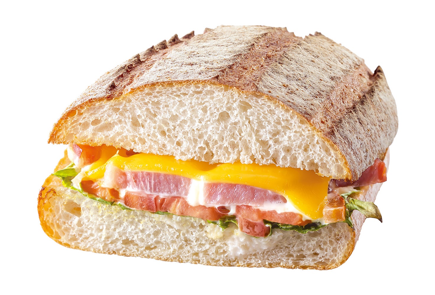 商品紹介:肉厚でジューシーなベーコン、フレッシュな野菜、やさしい塩味のチェダーチーズをサンドしました。ベーコンの旨味が溢れ出します。