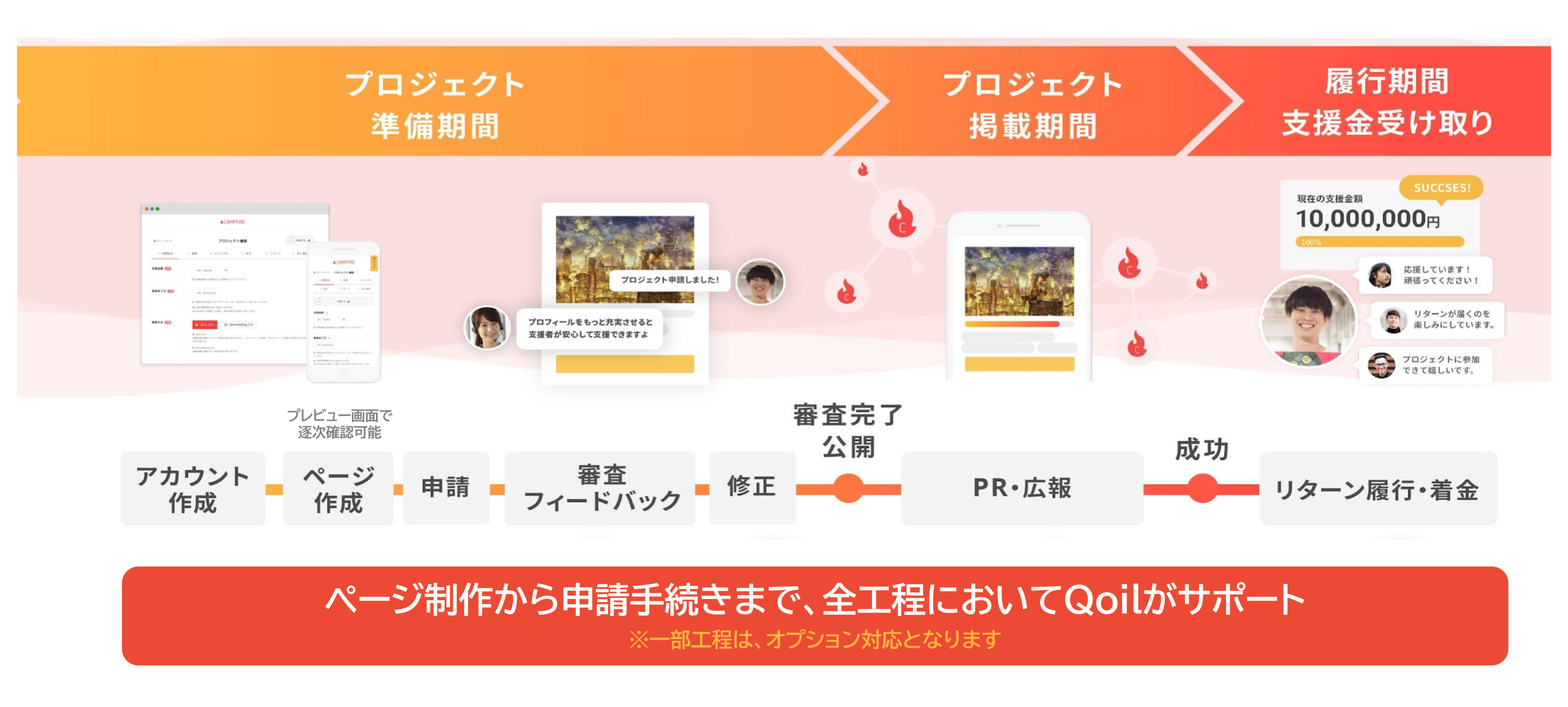 「FUND FAN FUN」は、購入型クラウドファンディングにおけるリターンやコミュニケーション設計などの戦略部分からクリエイティブ制作までワンストップで提供するプロモーション支援メニューです。Qoilがセールスプロモーション領域で長年培ったノウハウとテクニックをもとに、プロジェクトを届けたい相手に魅力的に届けるためのクラウドファンディングの実施を実現します。また、オプションとして掲載後のPRやSNS施策、過去の関連プロジェクトに支援した方へのターゲティング広告の実施、リターンアイテムの製作や配送業務なども対応可能です。