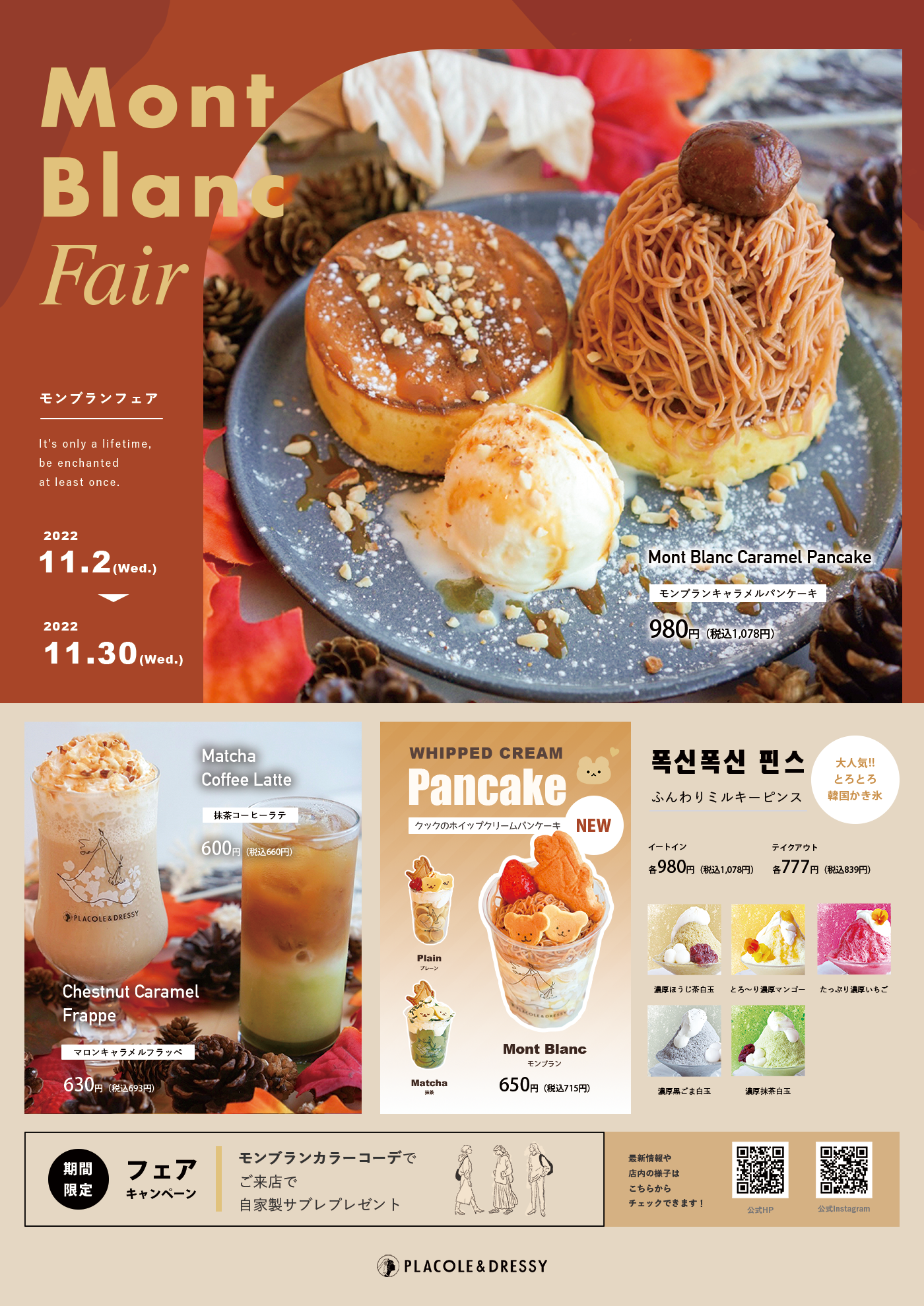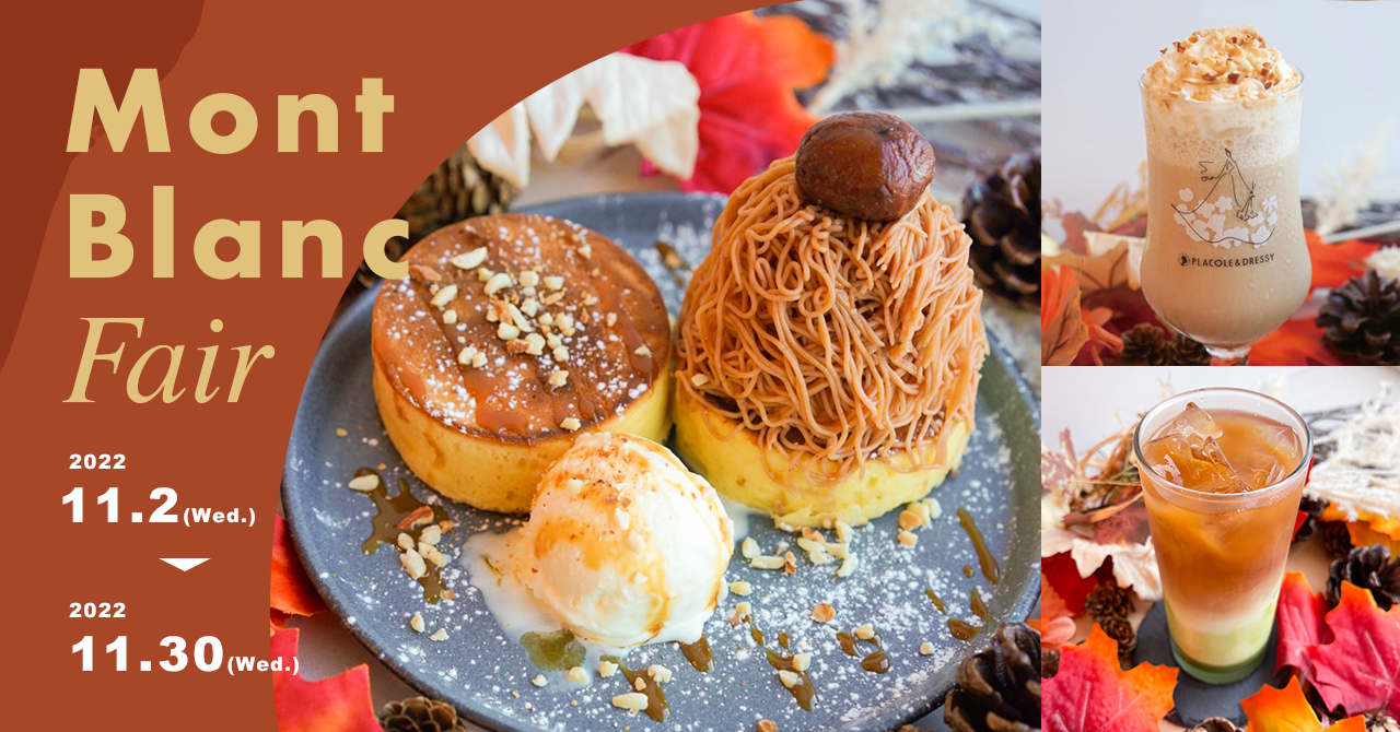 秋に旬を迎える栗をふんだんに使ったメニューを限定販売!なめらかな舌触りの『モンブランパンケーキ』や、キャラメルを使用したコク深い『マロンフラッペ』、見た目にも美しい『抹茶コーヒーラテ』など思わず写真を撮りたくなる、そしてとっても美味しい「モンブランフェア」をお楽しみください。