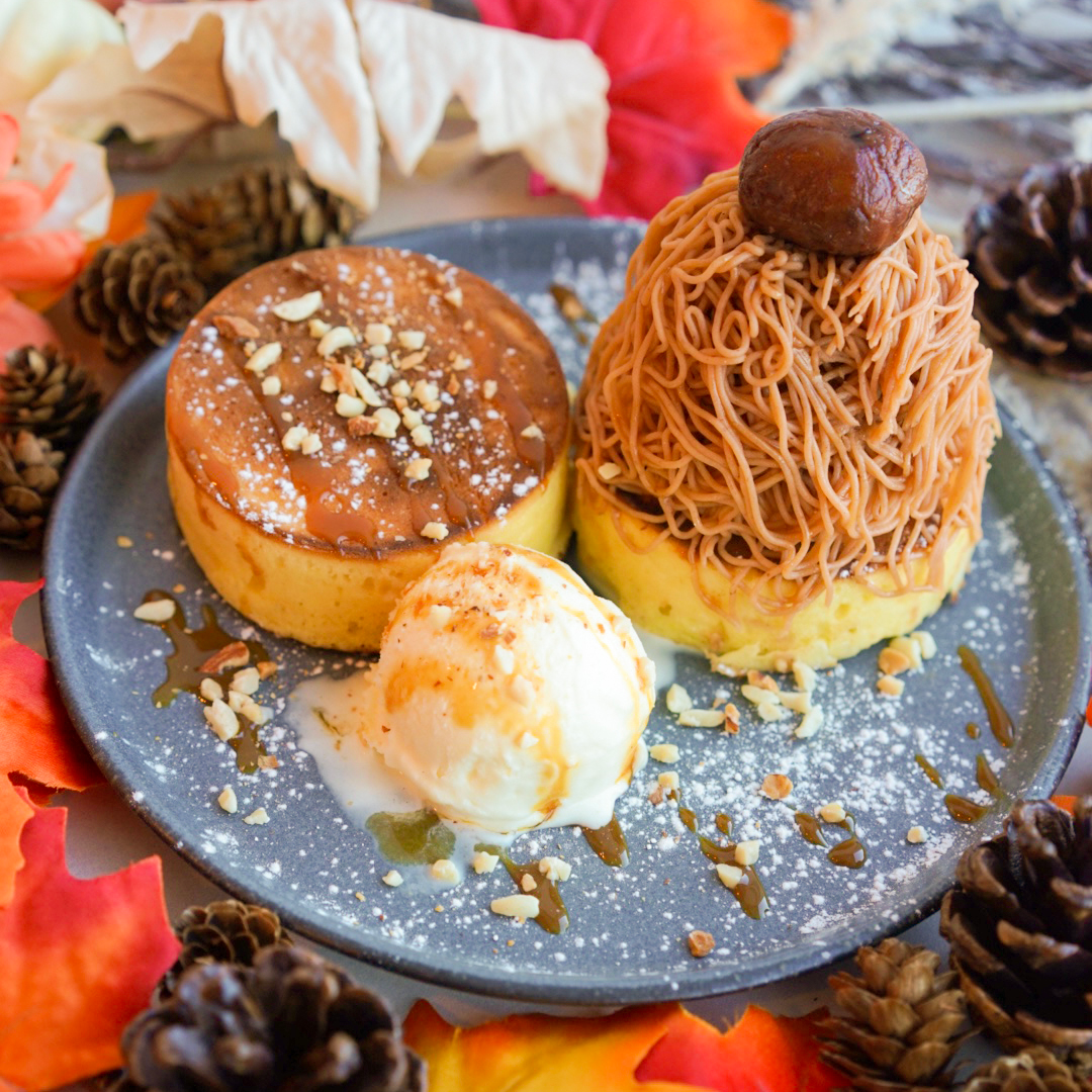 大人気の『シリアルパンケーキ』にモンブランver.が登場。なめらかな舌触りのモンブランとふんわりとしたパンケーキで、渋皮栗アイスの甘みも加わって、栗本来の深い味わいと甘みが楽しめます。栗のモンブランに栗のアイス、トッピングには渋皮栗をまるまる一つ使用しており、栗好きの方にはたまらない一品。栗とナッツのハーモニーが絶妙です。