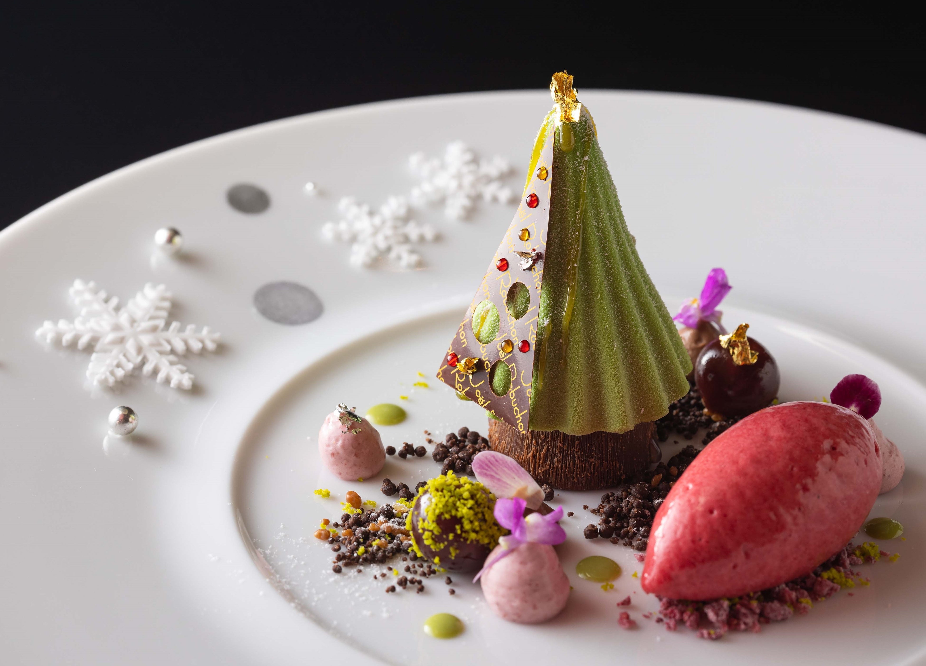 全7品のコースはクリスマスでしか味わうことのできない限定コースです。前菜のオマール海老は根セロリと黒トリュフを組み合わせたリッチな味わいです。シェフの志田が厳選したメインの和牛フィレ肉は、ジョエル・ロブションのスペシャリテであるポテトピュレとサラダパストラルと共にお楽しみください。デザートにはクリスマスツリーに見立てた濃厚なピスタチオのムースに爽やかなグリオットやフランボワーズを合わせた華やかな一品をご用意しております。