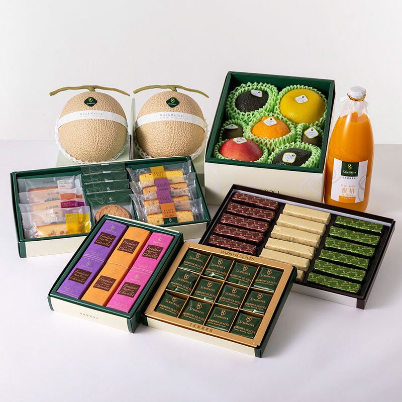 千疋屋総本店定番のマスクメロンを含めた果物が6種類と、うんしゅうみかんジュースやマロングラッセ等のグロッサリーが5種類入った福袋です。