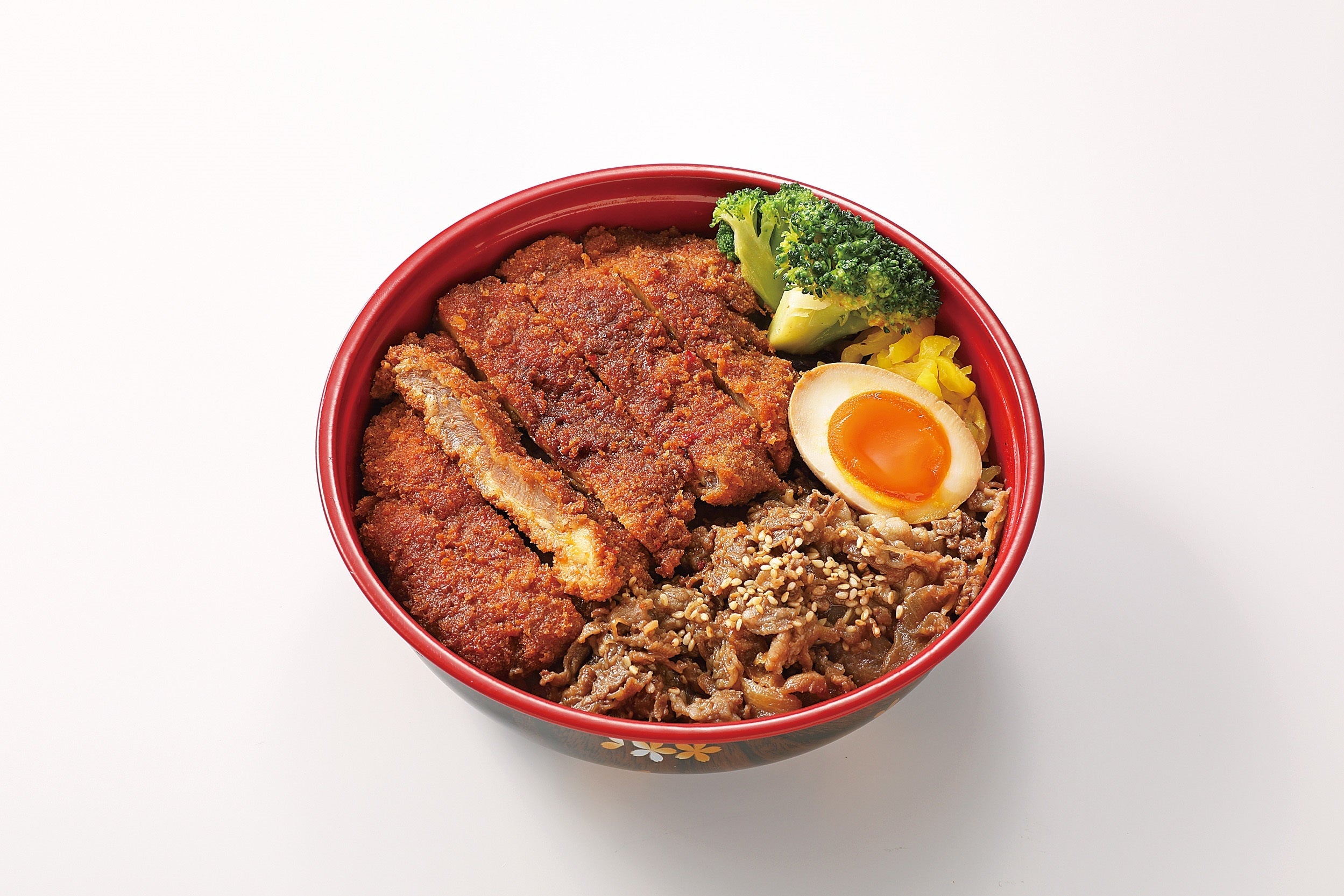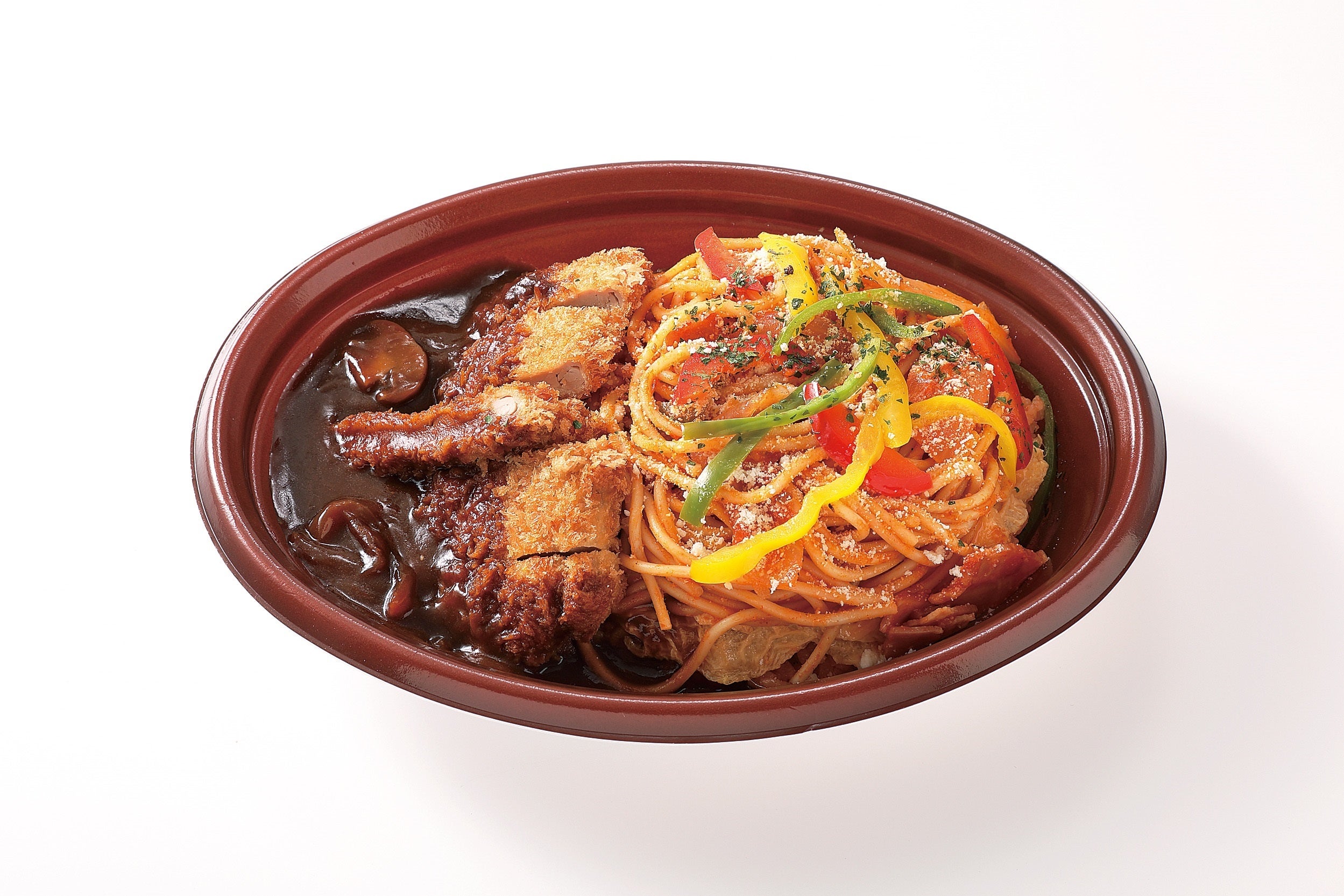 豚カツと、食欲をそそるカレー風味にアレンジしたナポリタンが楽しめる丼。