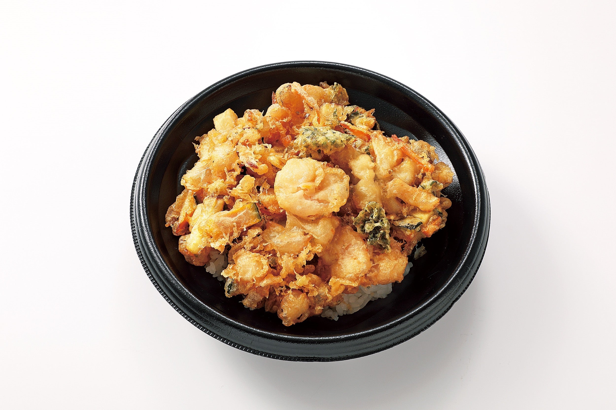 大人気のヒレ一口カツとカキフライ、野菜を盛り付けた彩り豊かな丼。