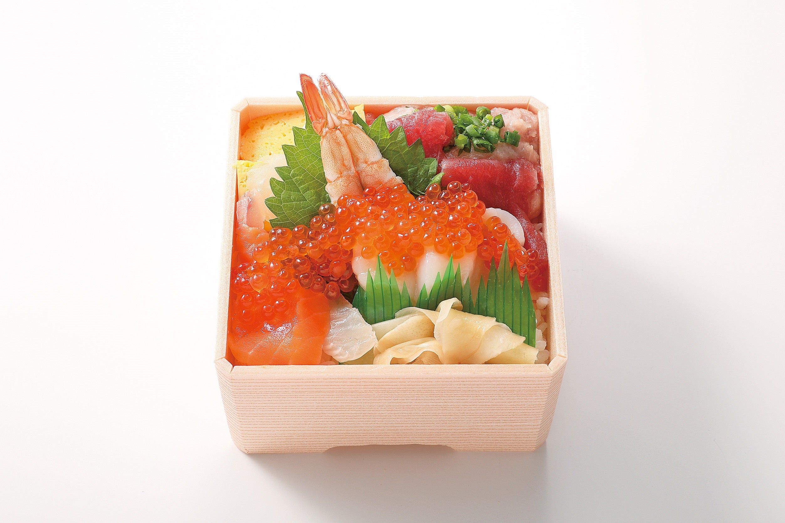 まぐろ、ねぎとろ、えび、鯛、ほたてにたっぷりのいくらををのせた華やかなどんぶりです。