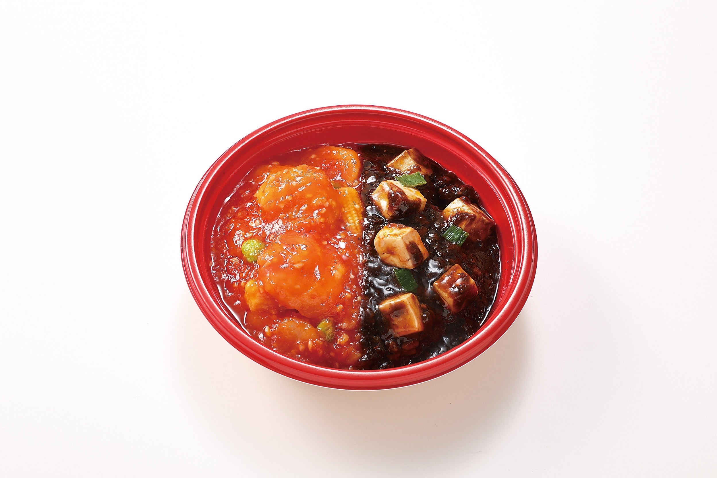 <上海デリ>「ハーフ&ハーフ丼(エビチリ&マーボー豆腐)」(径17㎝)594円《各日限定数50》