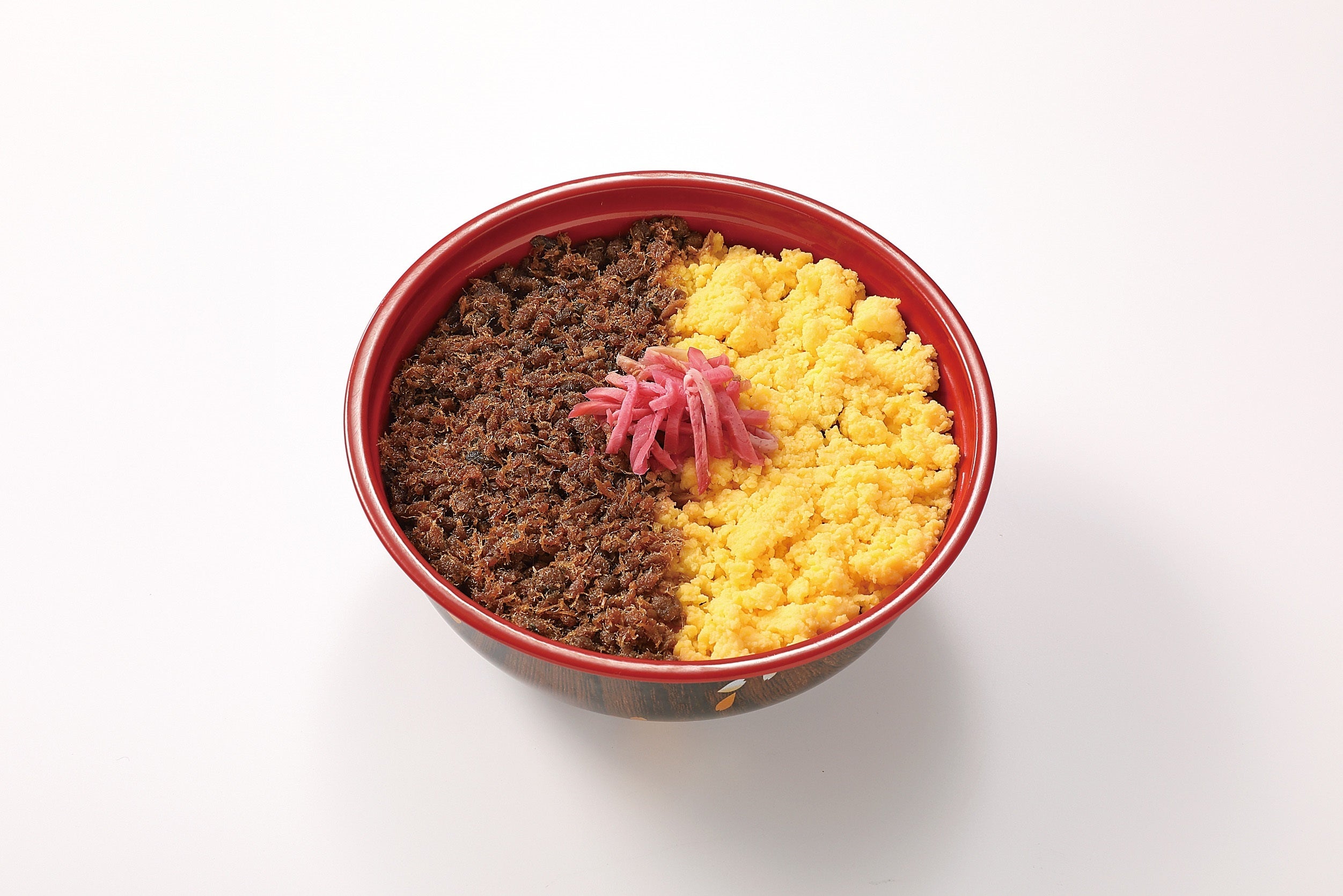 丹後地方のばら寿司の特徴である甘辛に味つけした鯖そぼろに、卵のそぼろを合わせた、2つの美味しさが楽しめる丼です。