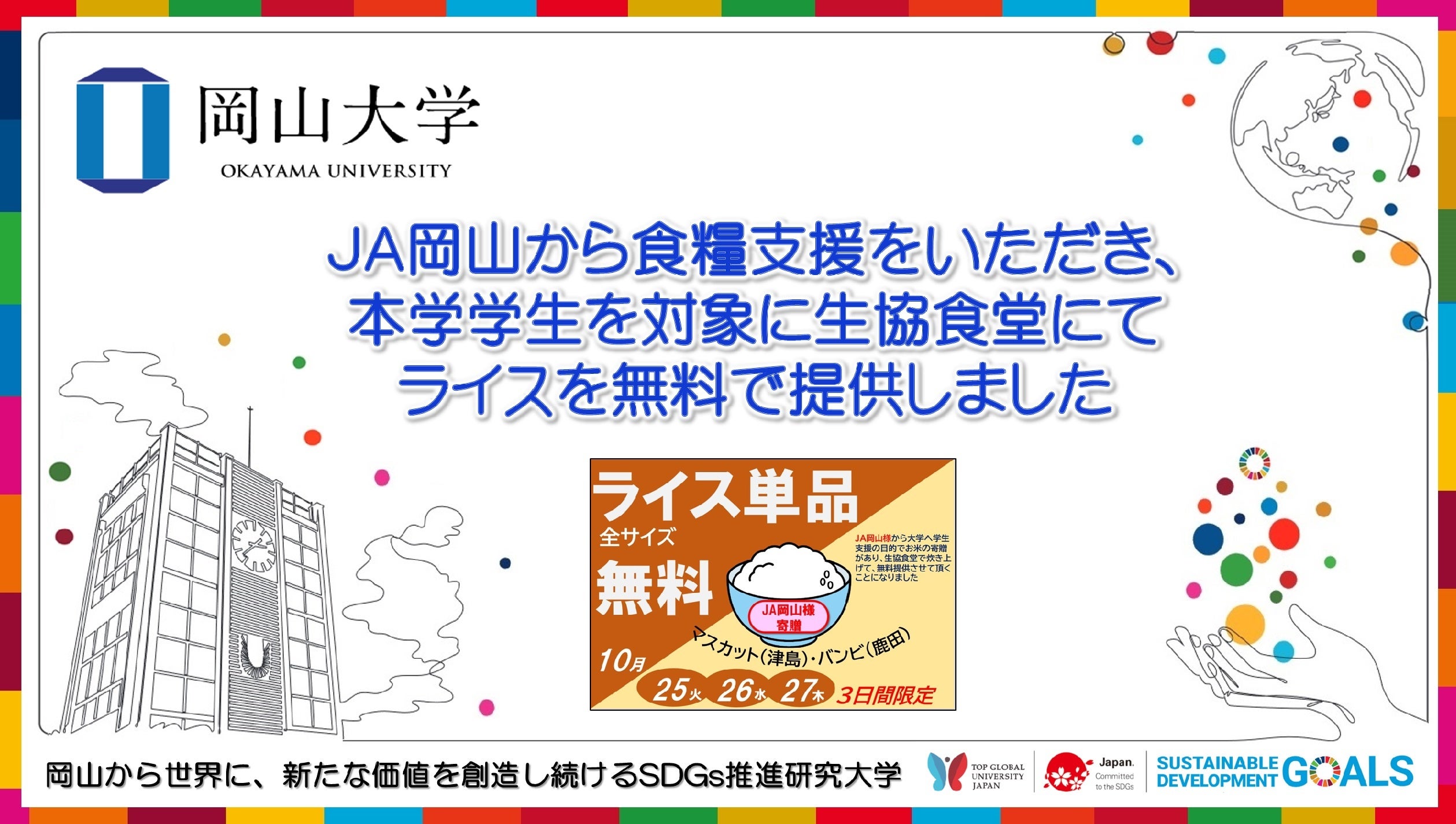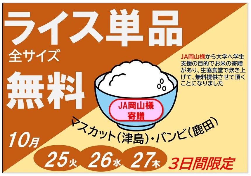 2022年10月25日~27日の3日間、JA岡山からの寄贈米を、岡山大学生活協同組合の協力のもと、マスカットカフェテリア(津島キャンパス)及びカフェテリアバンビ(鹿田キャンパス)にて、延べ8,461人分のライスを無料で提供しました。また、一部は学生寮や留学生宿舎にて配付しました。