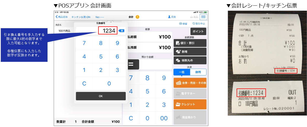 前払い会計時の引き換え番号手入力を現状最大2桁→最大4桁まで拡張しました。桁数の大きい待ち番号を付番する場合や、2個の引き換え番号(or呼び出しベル)を付番する場合などの運用シーンを想定しています。