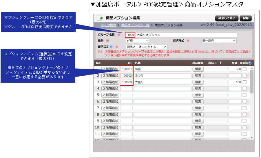 これまでシステム内部自動採番だった商品オプションのIDを画面上から任意でメンテナンスできるようになりました。