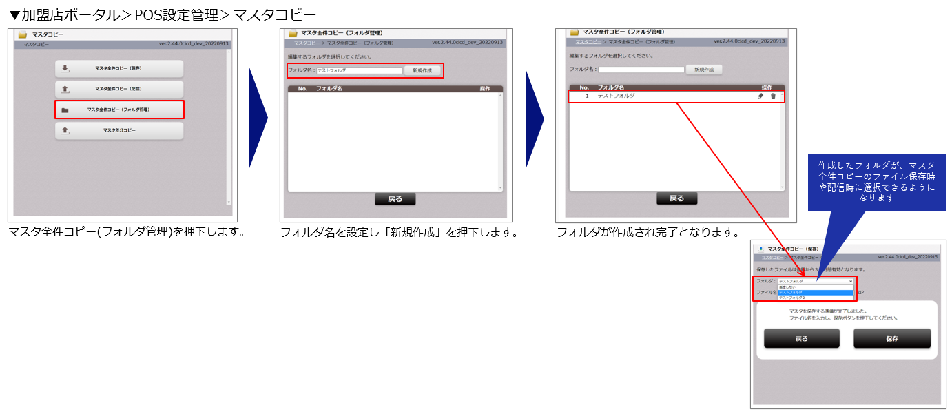 マスタ全件コピーの保存ファイル用のフォルダを作成できるようになりました。複数エリアの管理者などでマスタコピー運用をする場合に管理しやすくなります。