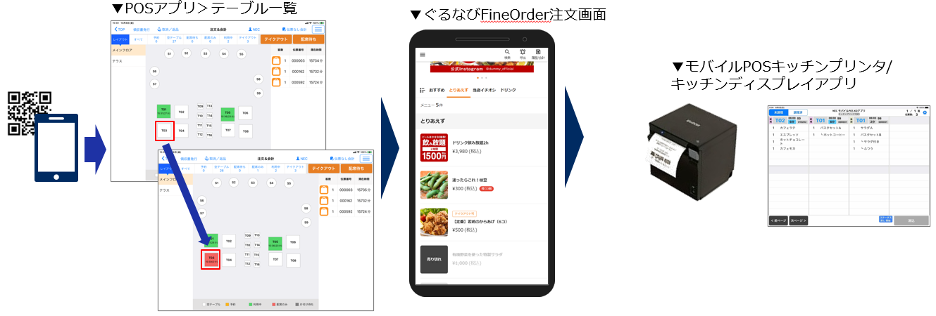 ぐるなび社が提供するモバイルオーダー「ぐるなびFineOrder」と連携できるようになりました。今回の連携により、飲食店はぐるなび社提供のモバイルオーダーサービス「ぐるなびFineOrder」で入力された注文情報をNECモバイルPOSに取り込み、注文情報の一元管理と会計処理ができるようになりました。