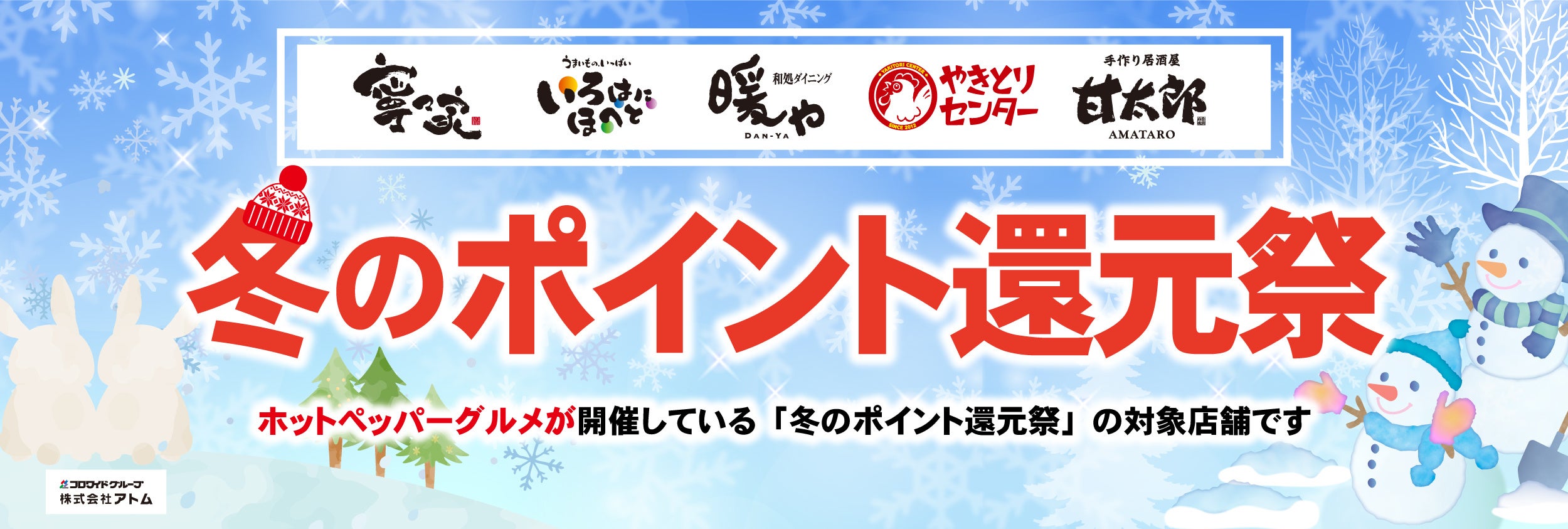 コロワイドグループの株式会社アトム(本社:神奈川県横浜市、代表取締役社長:山角豪)は2022年11月1日(火)~ホットペッパーグルメが開催している「冬のポイント還元祭」に居酒屋35店舗で参画致します。