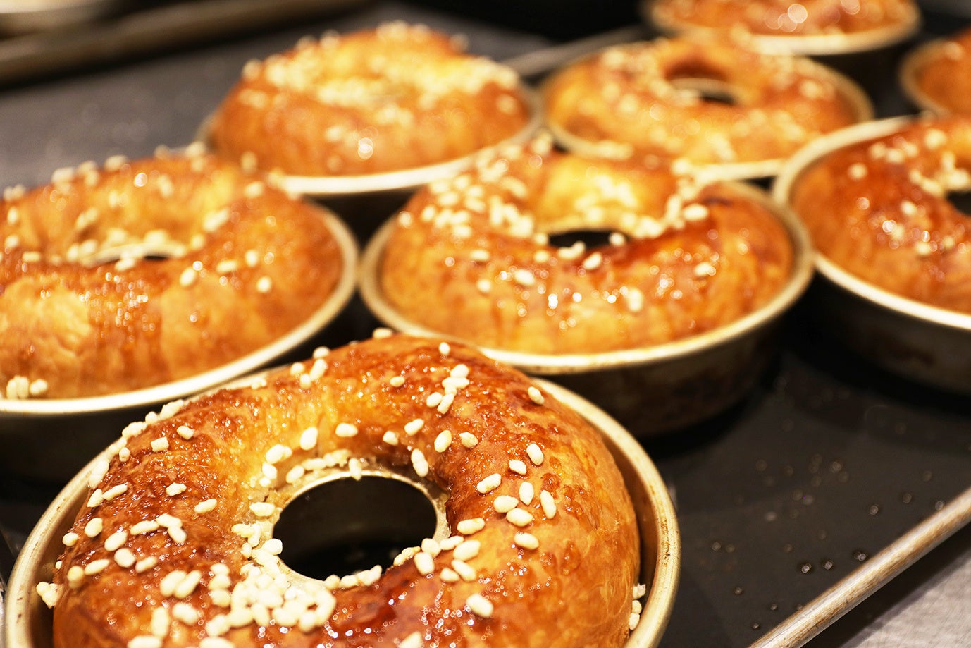 トッピングにお米のあられを使用した、「にっぽん」を感じていただけるチョコリングです。しっとりとしたデニッシュ生地にチョコチップを入れ、お米のあられとザラメでカリッと仕上げました。