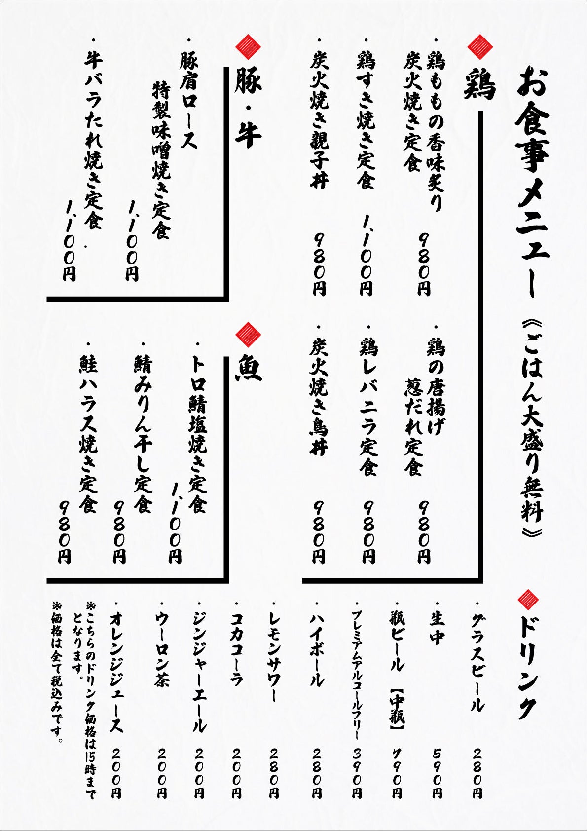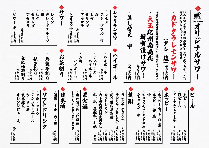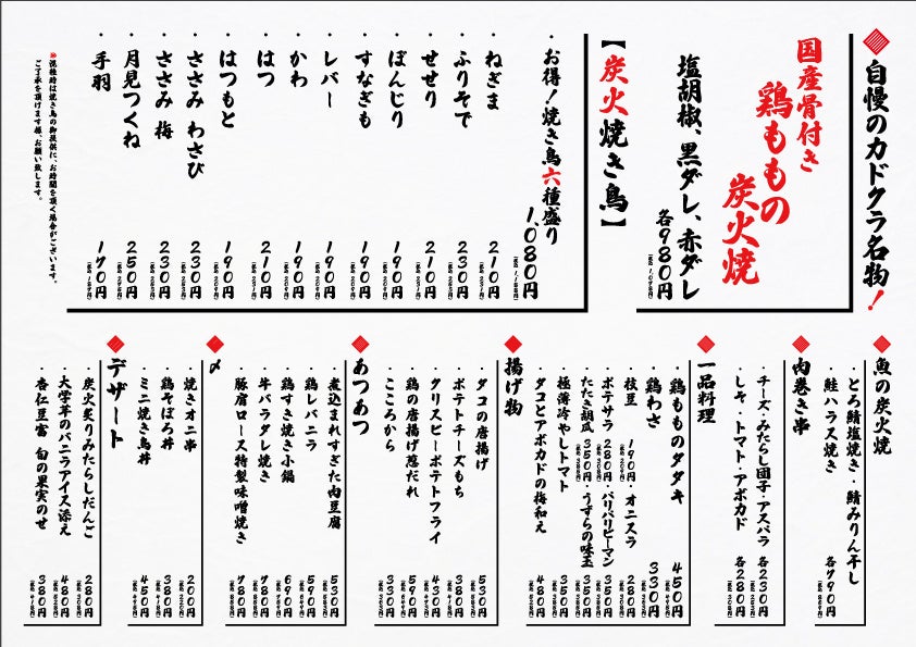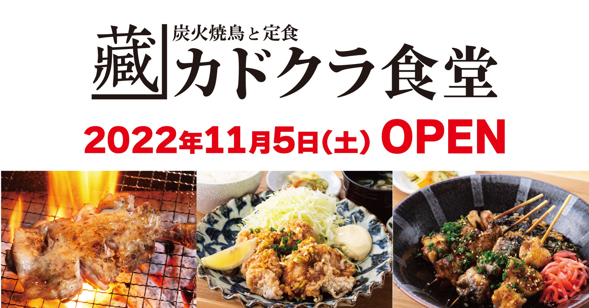 店 名 :炭火焼鳥と定食「カドクラ食堂」(2022年11月5日(土)AM11時オープン)