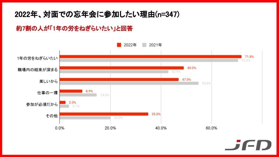 ●「参加したい」と回答した人にその理由を尋ねたところ、71.8%の人が「1年の労をねぎらいたいから」と回答しました。