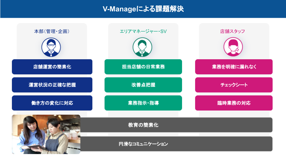 このような状況から、上記課題の解決、飲食店従業員の新たな働き方改革を実現すべく新サービス「V-Manage」を開発しました。