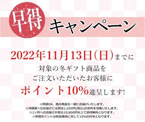 冬ギフトの対象商品をご購入のお客様には、ささら屋でご利用いただけるポイントを10%還元する「早得キャンペーン※」を実施します。早得キャンペーンの対象期間は2022年10月15日(土)~11月13日(日)になります。何かとお忙しくなる年末前にお歳暮ギフトをご検討されたい方は、早得キャンペーン期間中のご注文がお得です。