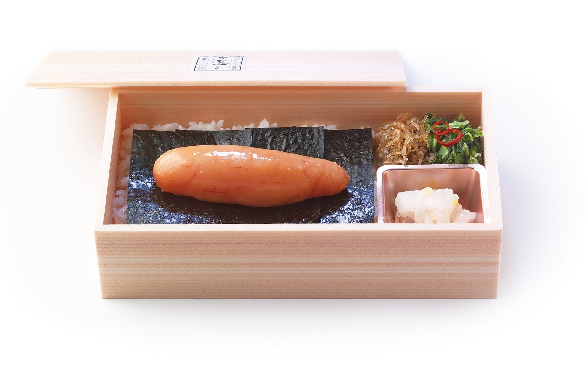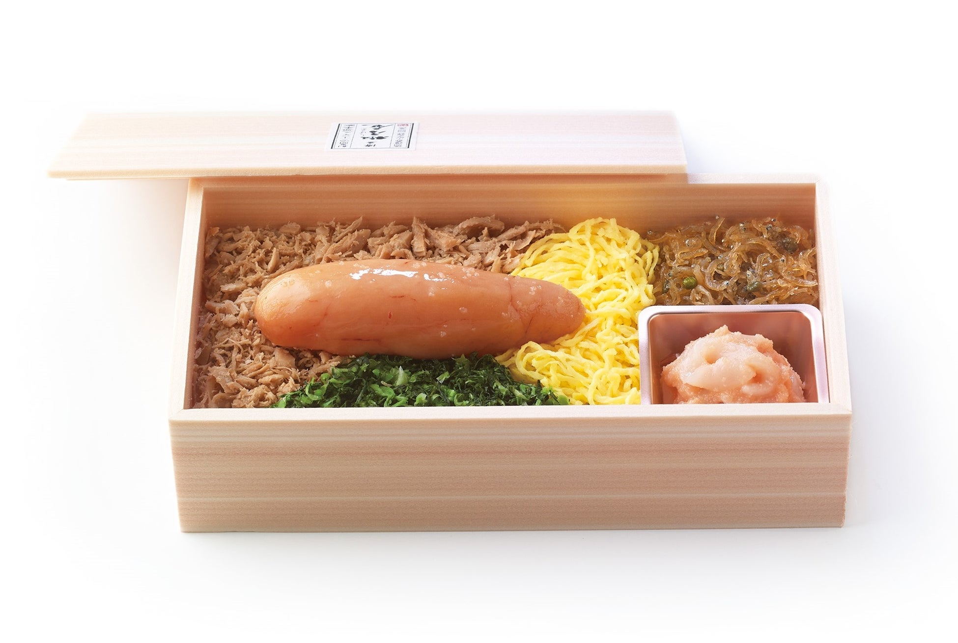 北海道産の卵をあごだしに漬けた特製「あごだしめんたいこ」が丸ごと一本入りの贅沢なお弁当です。博多珍味とご一緒にお召し上がりください。
