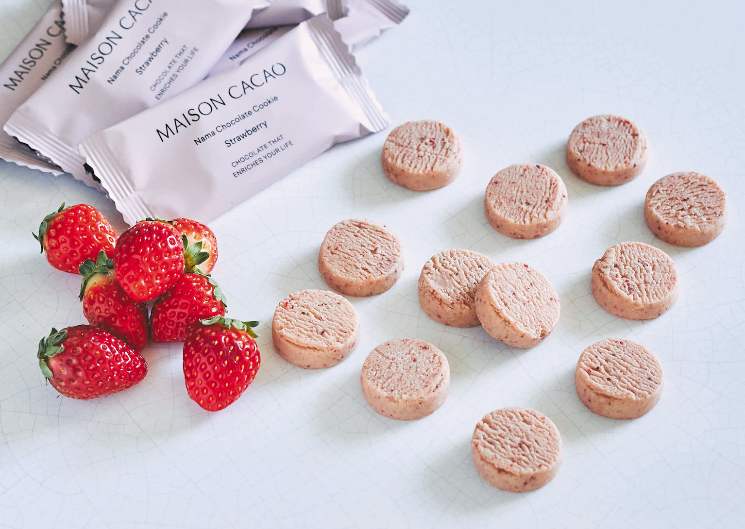 チョコレートと間違うほど、口どけなめらかな生チョコクッキーからもあまおうフレーバーが限定登場します。バニラや花の香りを持つ華やかなホワイトチョコレートにあまおうを合わせ、甘酸っぱさとあまおう本来の味わいの濃さを楽しめるクッキーです。