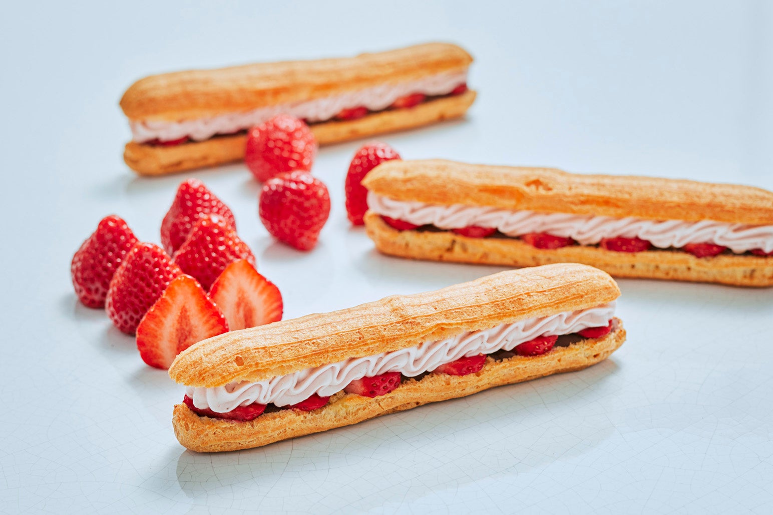 福岡県で親子2代で切磋琢磨しながら水と土作り、温度にこだわり、本来の旨みを引き出したあまおう作りに取り組む友納親子の逸品を使用した限定エクレア。シュー生地の中はミルクチョコレートのガナッシュに、みずみずしいあまおうの果肉、あまおうの生クリームをサンドしています。
