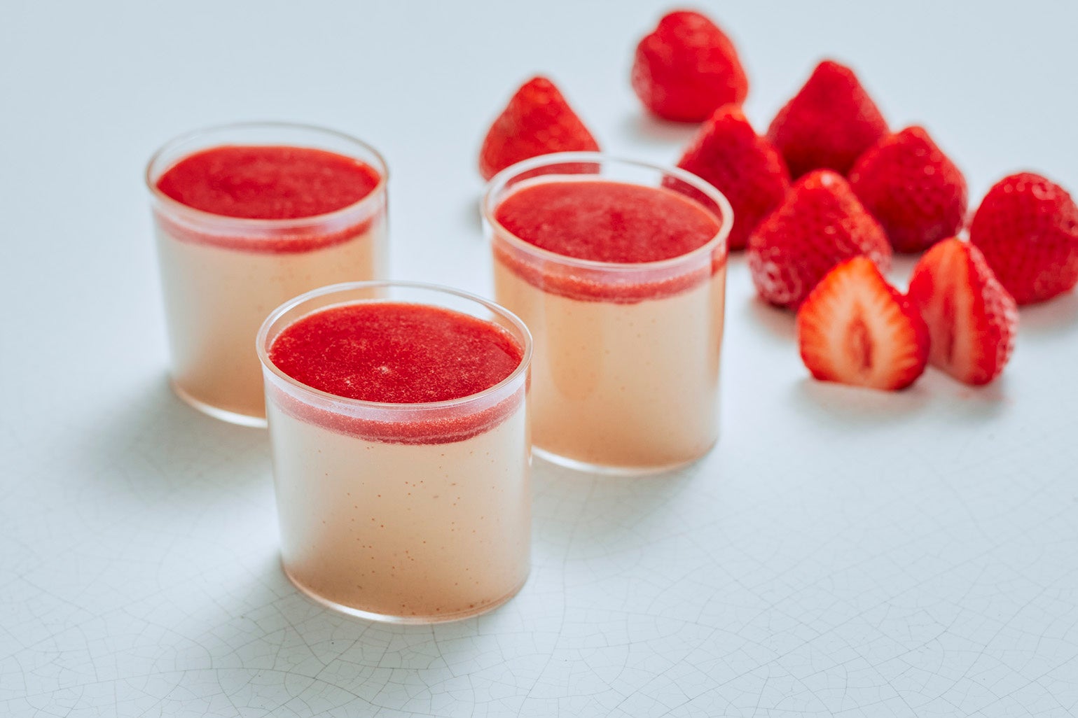 とろける口どけの生チョコプリンは、生地にもソースにも贅沢にあまおうを使用しました。プリンはコロンビア産のまろやかな甘みのホワイトチョコレートにあまおうを合わせ、上には甘酸っぱいあまおうのソースをかけました。