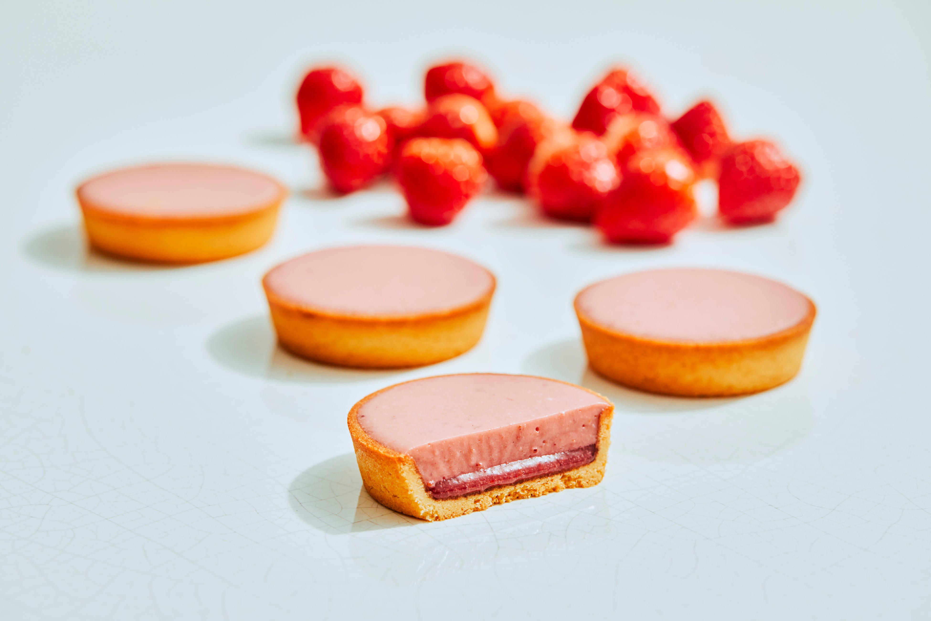 シンプルな美しさにこだわりながらも、味わいと食感を4層で作り込んだ一品です。手焼きのタルト生地にあまおうの濃厚なソースを流し、ホワイトチョコレートと合わせたなめらかなあまおうクリームを重ね、食感の良いチョコレートでコーティングをしました。