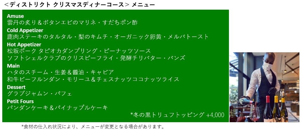 雲丹や松坂ポーク、ソフトシェルクラブ、和牛など、贅沢な食材を特別な日にふさわしく華やかに仕上げました。聖なる夜に好奇心くすぐるアジア各国の美食体験を通じて、まるで海外旅行をしているかのような、ディストリクトならではのとんでもなくスペシャルなショートトリップへ誘います!