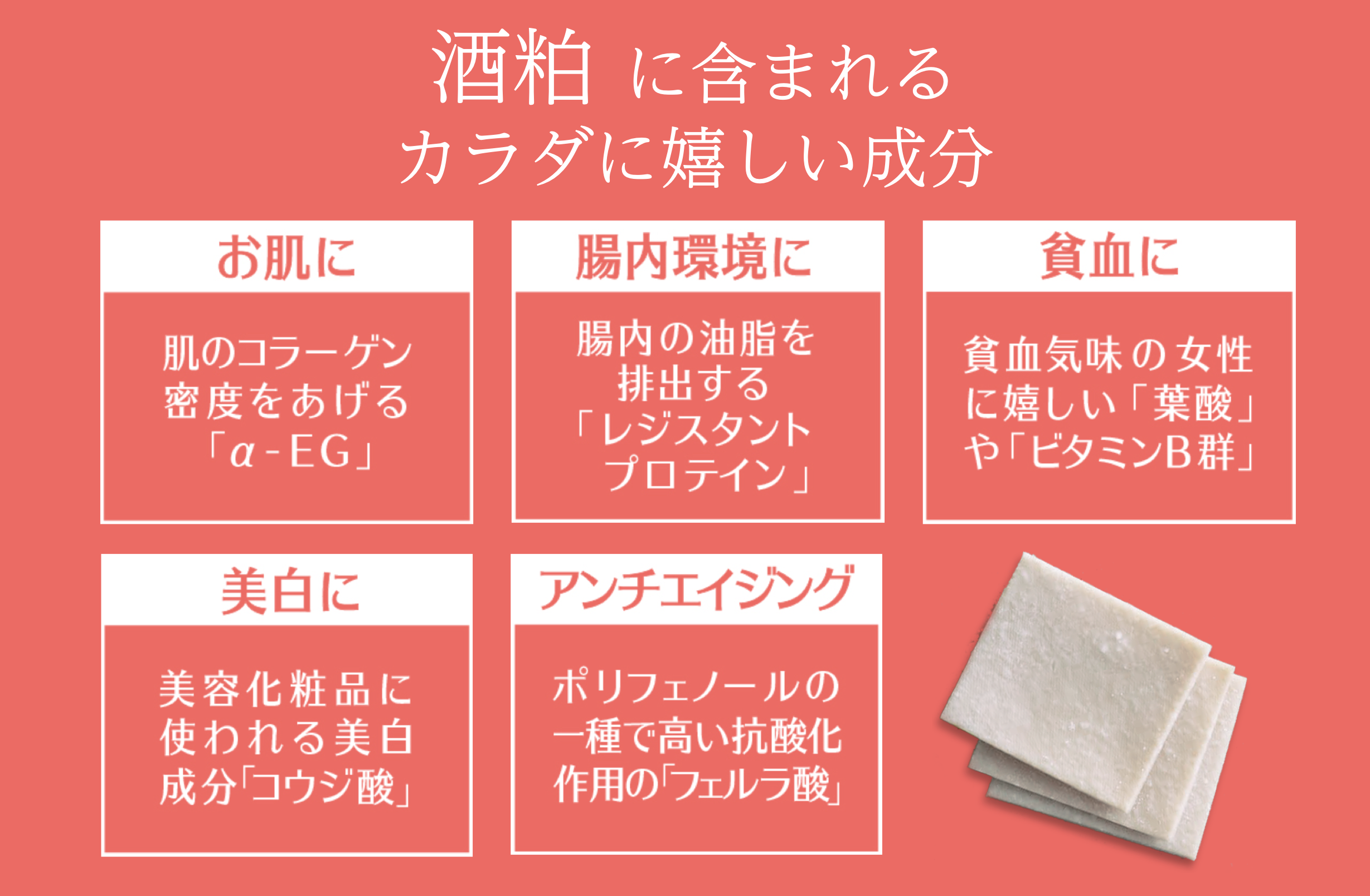 酒粕には、日本酒の味を形成する旨味成分「α-EG」が含まれています。「α-EG」とは麹由来の酵素により生み出される、酒粕に含まれる成分のひとつ。「透明感のある肌にする」「シミを薄くする」「しわやたるみなどの肌老化の原因となる炎症を抑える」といった美肌効果があり、肌のコラーゲン密度が上がると言われています。