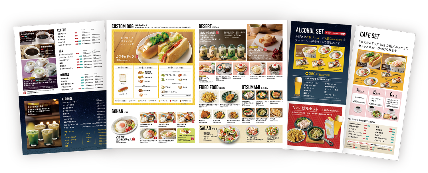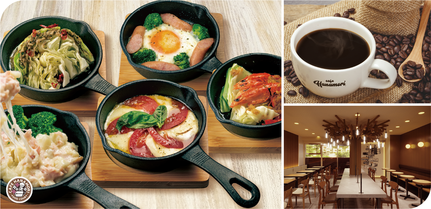 「Cafe Hanamori」では、豊富なカフェメニューやスイーツに加え、アルコール、バルメニューもご用意。フードコートのように“カフェ”の枠にとらわれない様々なサービスを1店舗で実現しております。