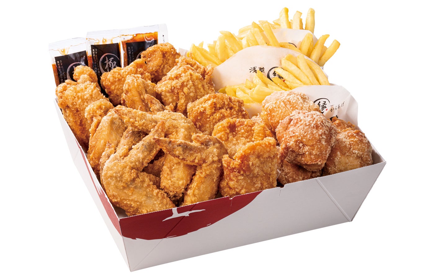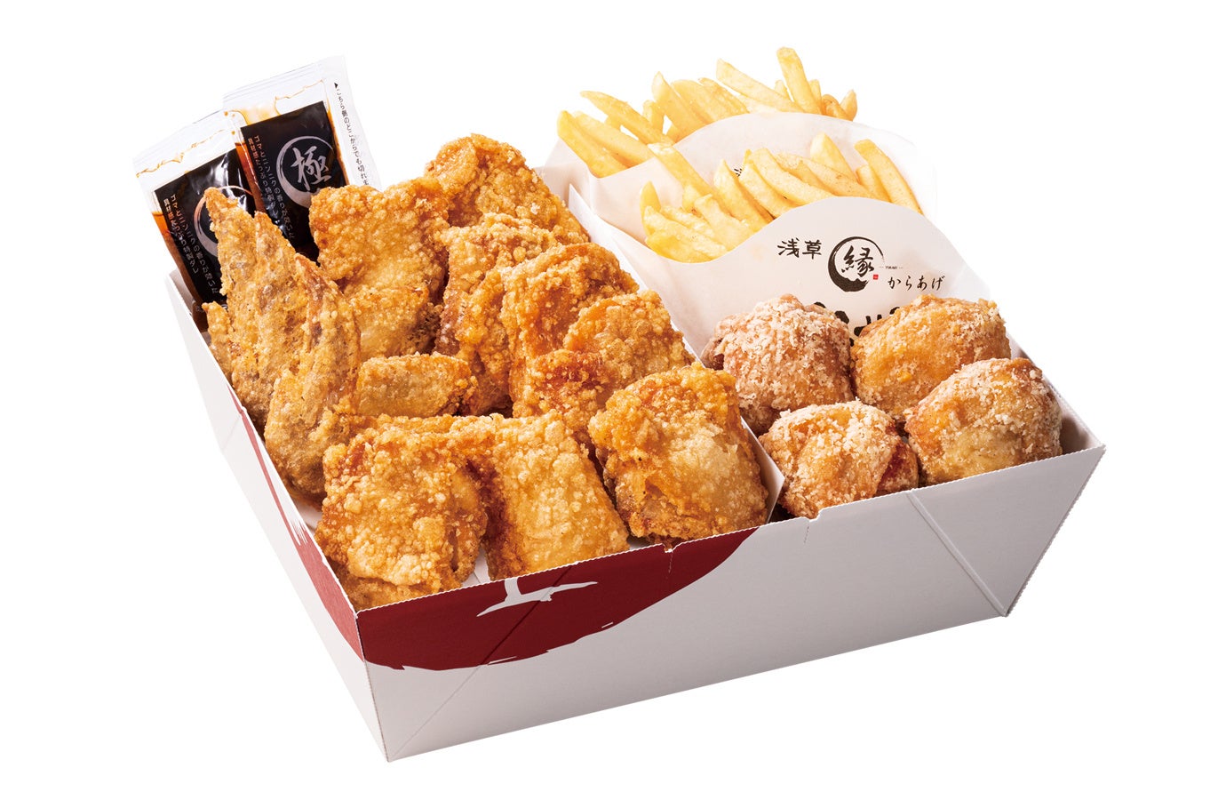 からあげのテイクアウト専⾨店「からあげ縁(ゆかり)」は、ニンニク・⽣姜不使⽤の秘伝のタレに1⽇漬け込み、旨味を逃がさないよう商品ごとに独⾃の製法を確⽴。からあげは、ご注⽂を頂いてから揚げ始め、カラッと⾹ばしい揚げたてをご提供しております。