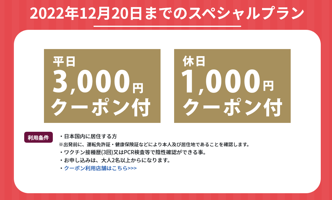 全国旅行支援割引後実質支払額 お一人様大人・子供同額 土日祝¥7,080- クーポン¥1,000-ついてきます