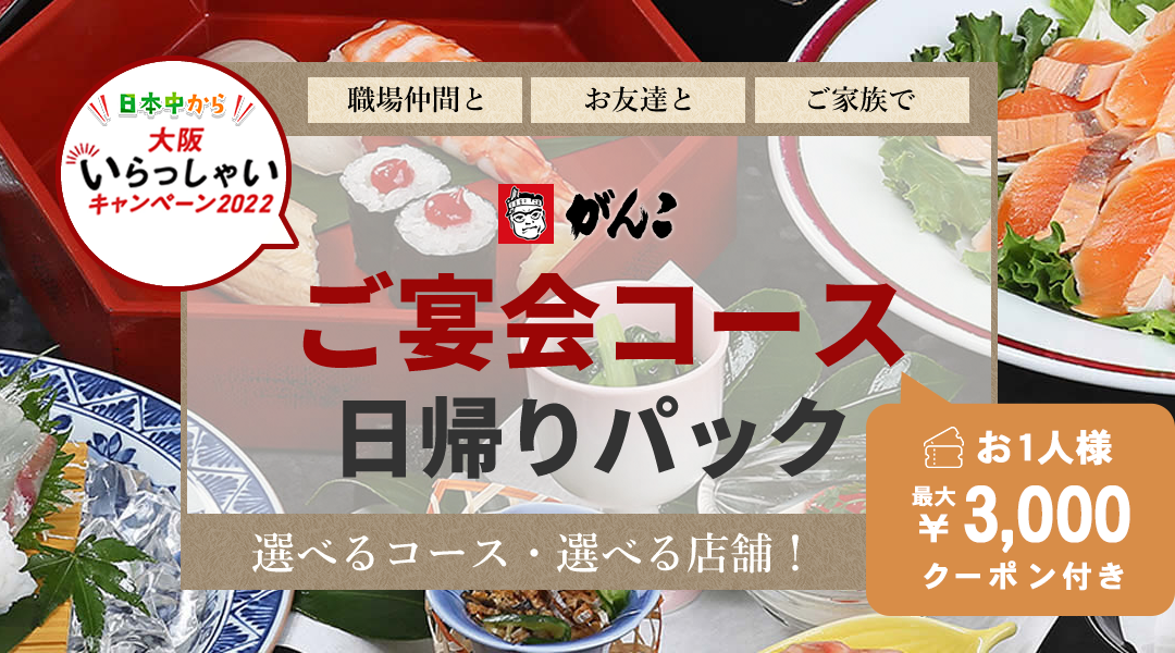 「大阪いらっしゃいキャンペーン」がんこ宴会コース日帰りパックは、大阪府内のがんこ6店舗から選べる宴会コースとお車がセットになったパックツアー♪