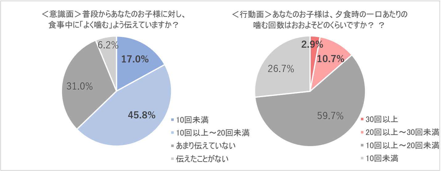 「普段から子どもに対し、食事中に『よく噛む』よう伝えていますか?」という質問に対して、17.0%が「頻繁に伝えている」、45.8%が「時々伝えている」と回答し、およそ6割の親が「よく噛むこと」を子どもに伝えていることがわかりました。一方で、「夕食時の一口あたりの噛む回数」を問う質問では、専門家が推奨する30回以上子どもが噛んでいると回答した親は2.9%しかおらず、86.4%もの親が子どもが一口あたり噛んでいる回数は20回未満と回答したことが判明しました。親が「よく噛むこと」を伝えているにも関わらず、子どもは実践できていないことが分かりました。