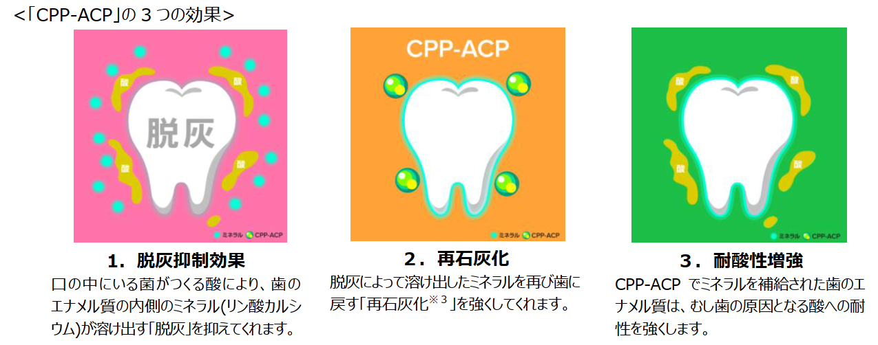 ・「CPP-ACP」とは、牛乳由来の成分、乳タンパクからできたCPPと非結晶リン酸カルシウム(ACP)との複合体。メルボルン大学歯学部エリック・レイノルズ教授の長年に渡る研究により誕生しました。