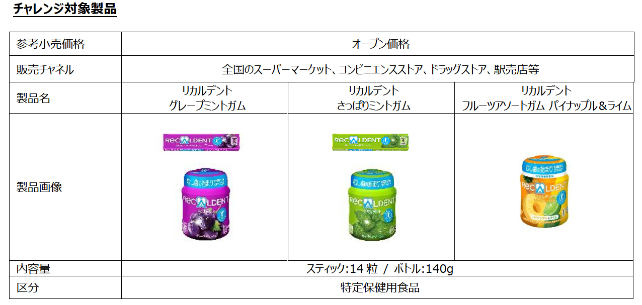 本チャレンジの対象となる「リカルデント」製品は特定保健用食品。3つの働き「むし歯の始まり(脱灰)抑制」「再石灰化を促進」「耐酸性を増強」をもつ関与成分「CPP-ACP」を配合しているので、歯を丈夫で健康に保つことに役立ちます。「CPP-ACP」を配合している特定保健用食品のガムは「リカルデント」だけ。