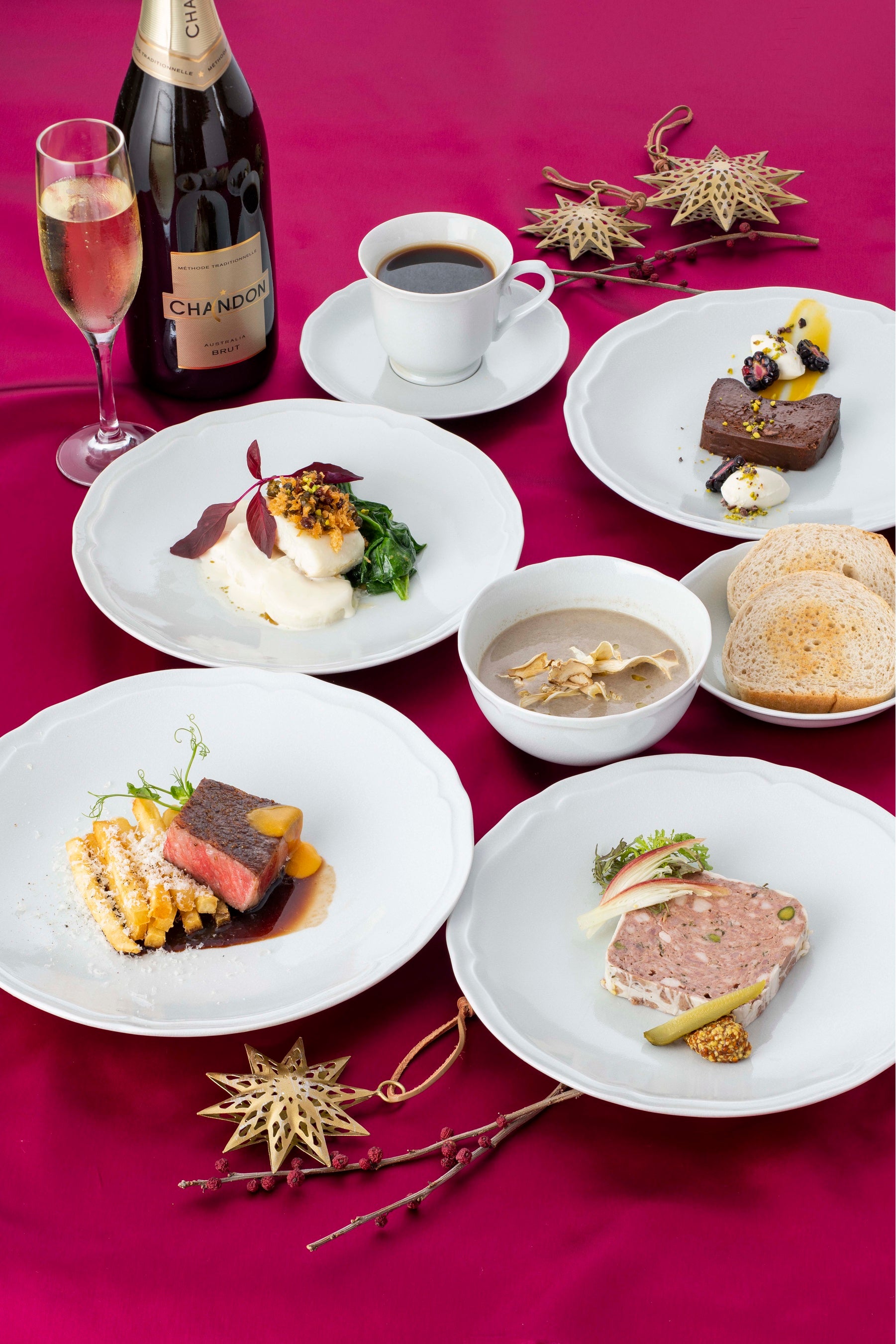 このディナーコースは、15年連続ミシュランガイド東京の1ッ星を獲得したフレンチレストラン「レザンファン ギャテ」のテリーヌによる前菜から始まり、スープ、メインの佐賀牛サーロインのロースト、お食事のラストを飾るデザートで構成、華やかなクリスマスイベントを演出するにふさわしいフルコースとなっています。