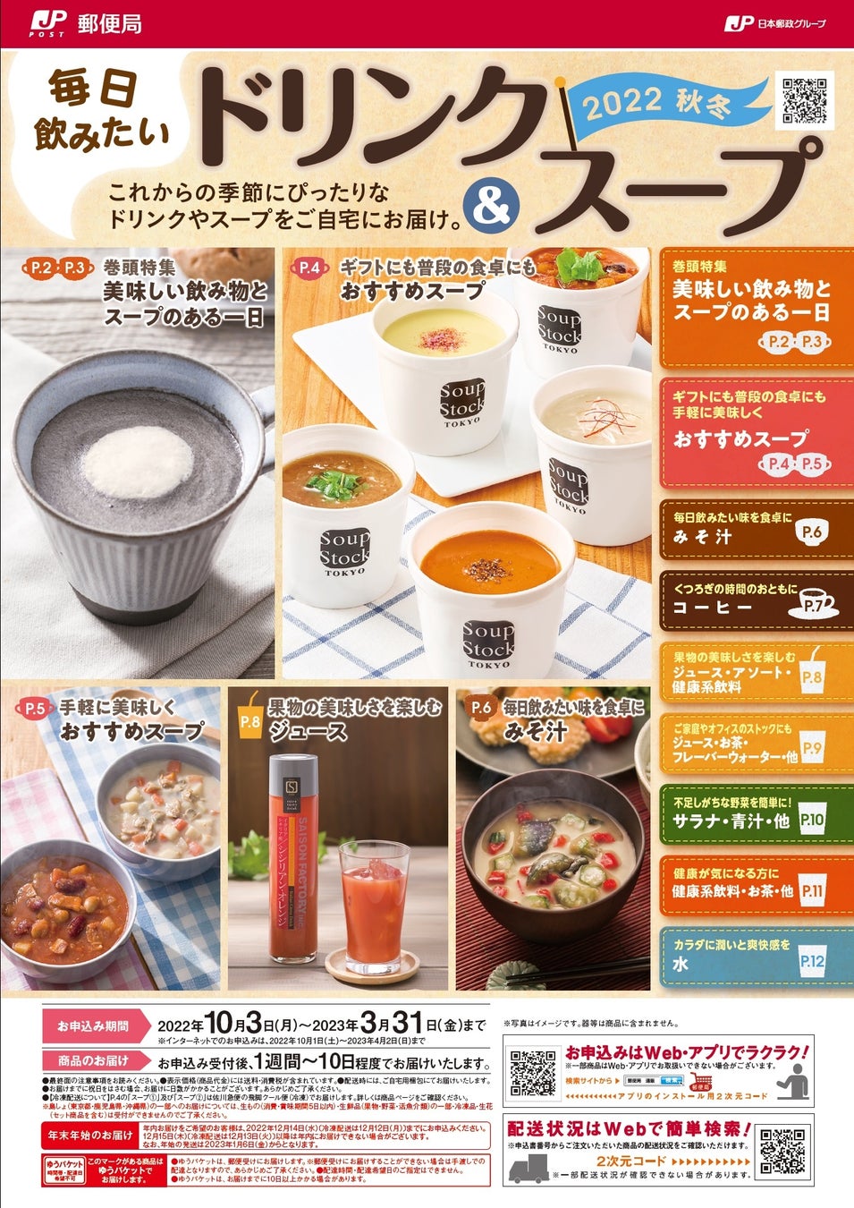 株式会社郵便局物販サービス(東京都江東区、代表取締役社長 荒若 仁)は、「2022 毎日飲みたいドリンク&スープ 秋冬」カタログを2022年10月3日(月)から2023年3月31日(金)まで販売中です。