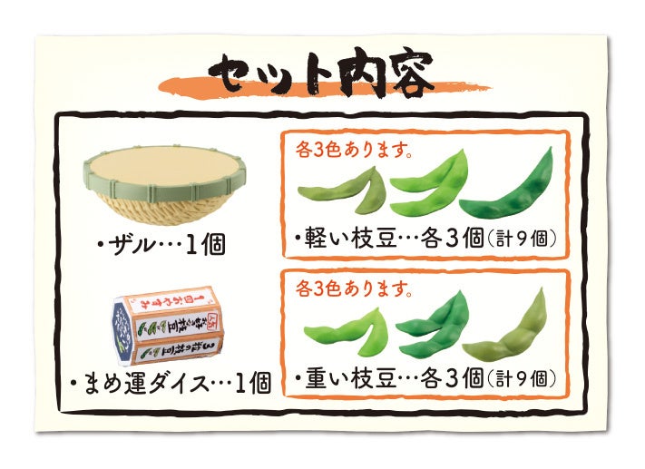 セット内容:●ザル…1個 ●まめ運ダイス…1個 ●軽い枝豆…各3個(計9個)●重い枝豆…各3個(計9個)