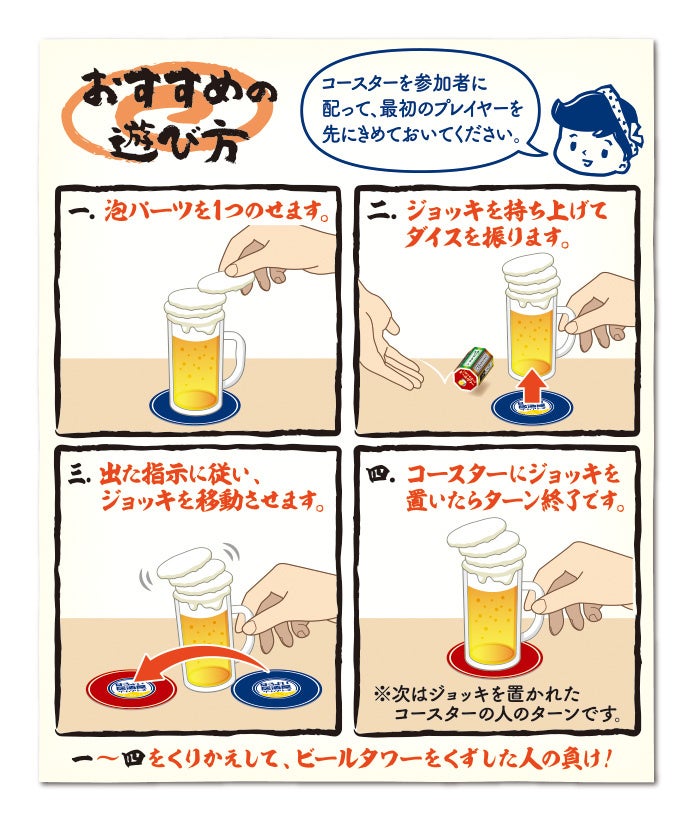 「こぼさず運べ!ビールタワー」は、ビールジョッキに泡パーツをのせてサイコロ(ご指名ダイス)を振り出た指示に従いジョッキをコースターに移動させて、ビールタワーをくずした人が負けになるゲームです。各泡パーツの形状も微妙に異なる為グラグラ感もスリル満点です。