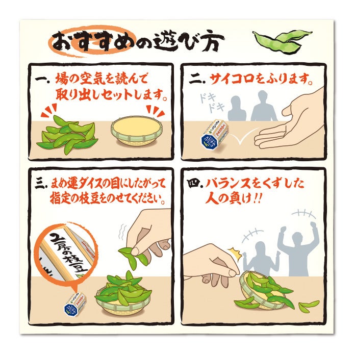 「グラグラえだまめバランス」は、付属のサイコロ(まめ運ダイス)に従ってザルの上に枝豆をのせていきバランスを崩した人が負けになるハラハラドキドキの究極のおつまみゲームです。本物そっくりの枝豆は、重さ・色・房数も様々でサイコロの出目により難易度も変化します。
