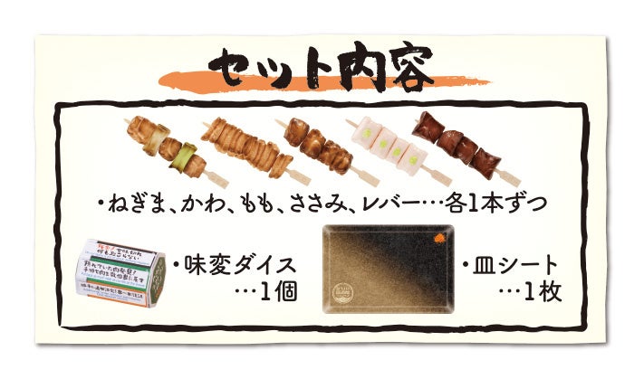 セット内容:●ねぎま、かわ、もも、ささみ。レバー…各1本ずつ ●味変ダイス…1個 ●皿シート…1枚