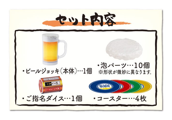 セット内容:●ビールジョッキ(本体)…1個 ●泡パーツ…10個 ●ご指名ダイス…1個●コースター…4枚
