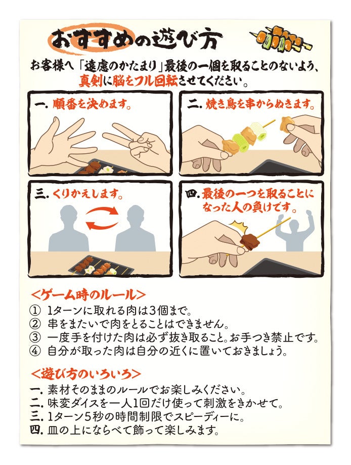 「やきとりラストワンバトル」は、順番に焼き鳥を串からぬいていき、最後の焼き鳥を取った人が負けになる心理戦ゲームです。飲み会等で、最後1個の食材を誰が食すか?と皆が遠慮し合うあるあるを再現しています。