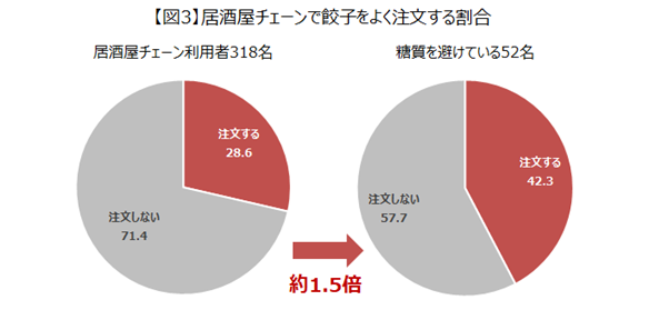 幸福度の他にも、日頃の健康に対する意識と注文するメニューの相関を調査した結果、「糖質を避けている人」のほうが、全体平均よりも約1.5倍、餃子を注文する割合が高いことがわかりました。(図3)
