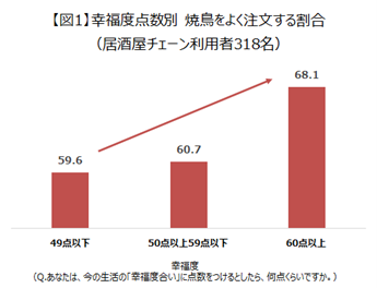居酒屋チェーン利用者に対し、居酒屋でよく注文する食事メニューについて伺ったアンケートと、ご自身の今の幸福度を点数にするアンケートを掛け合わせたところ、幸福度が高い人ほど、焼鳥を注文する傾向があることがわかりました。(図1)