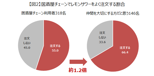 居酒屋でよく注文するドリンクを伺ったアンケートと、ご自身の価値観に関するアンケートを掛け合わせたところ、「仲間を大切にする人」ほど、レモンサワーを注文する傾向があることがわかりました。(図2)